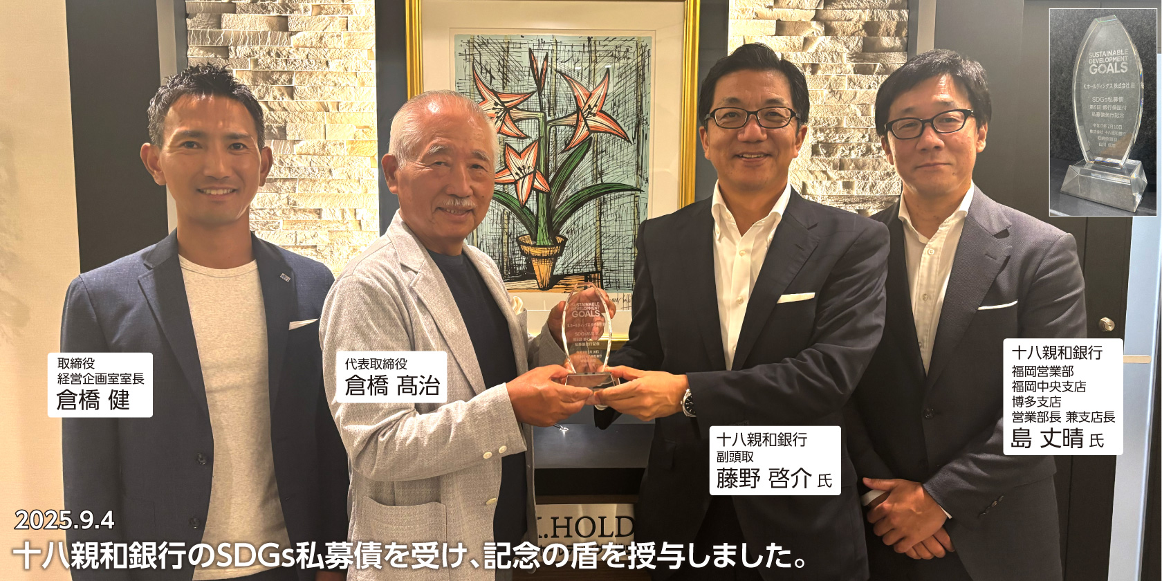 - 十八親和銀行のSDGs私募債を受け、記念の盾を授与しました。